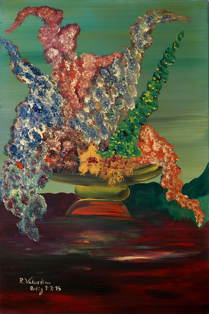 Flowers in beer Mug. Acrylic on canvas 30’’x 24’’ 5.11.95 Reference # SL002