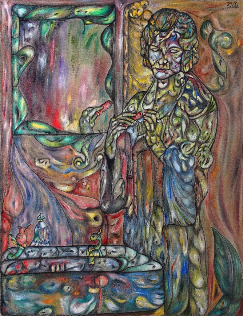 (RVO) primarily uses oil paints on canvas, which allows for rich textures and vibrant colors. This medium also supports the detailed and layered approach characteristic of his work.